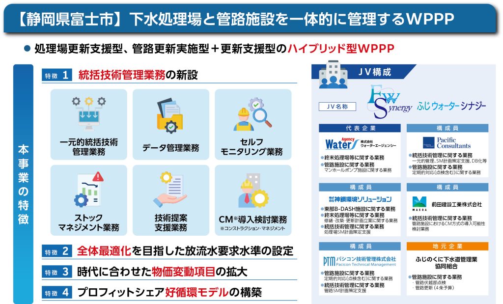 当社を代表企業とする共同企業体(JV)『ふじウォーターシナジー』は、静岡県富士市が公募していたウォーターPPP事業「富士市終末処理場管理運転等業務委託」を受託し、10月29日に契約を締結しました。